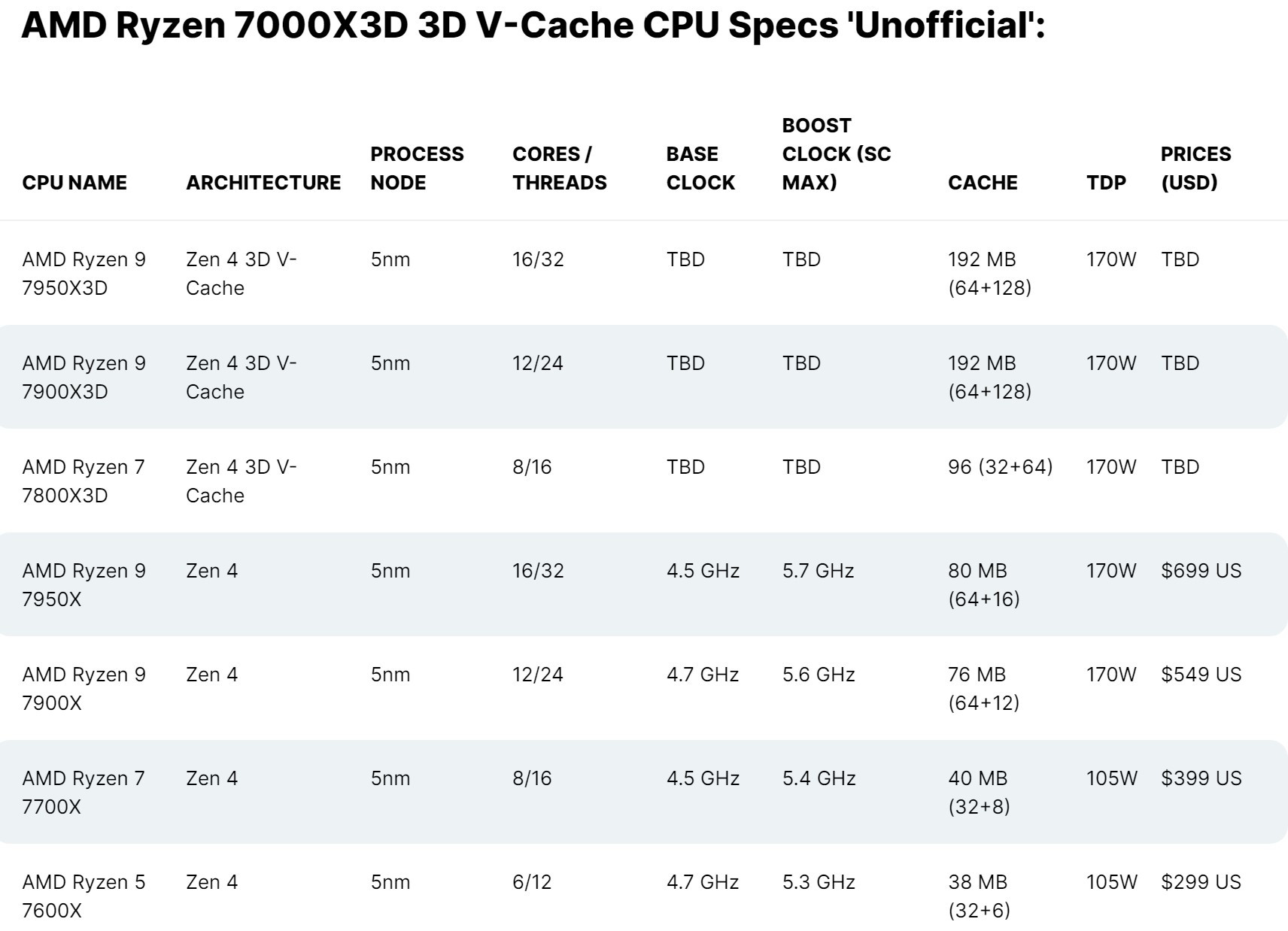 Theo dự kiến, AMD sẽ ra mắt ba mẫu chip mới thuộc dòng Ryzen 7000X3D, bao gồm 7950X3D, 7900X3D, và 7800X3D. Những con chip này hứa hẹn sẽ mang lại hiệu suất cao với cấu hình lên đến 16 nhân “Zen 4”, bộ nhớ đệm 3D V-Cache lên tới 64MB, và xung nhịp tối đa đạt 5,7 GHz. Đây được xem là những đối thủ cạnh tranh trực tiếp với các mẫu chip Intel thế hệ 13 “Raptor Lake”.