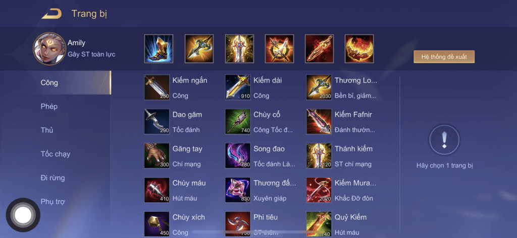 Lưu ý: Amily cần trang bị đầy đủ các món đồ gia tăng sát thương vật lý để tối ưu hóa khả năng gây sát thương trong giao tranh.