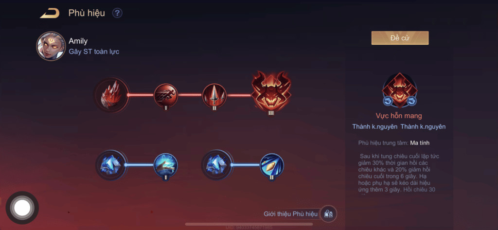 | Chiêu Cuối | Gây sát thương phép lớn và tăng sức mạnh cho bản thân. Giúp Amily có thể tạo ra những pha giao tranh mạnh mẽ. |