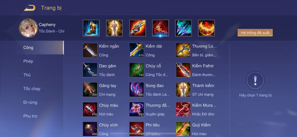 Để tối ưu hóa sức mạnh của Capheny, cần chú trọng vào việc chọn những trang bị có khả năng gia tăng sát thương vật lý và tốc độ đánh. Một số trang bị nên lên cho Capheny bao gồm: