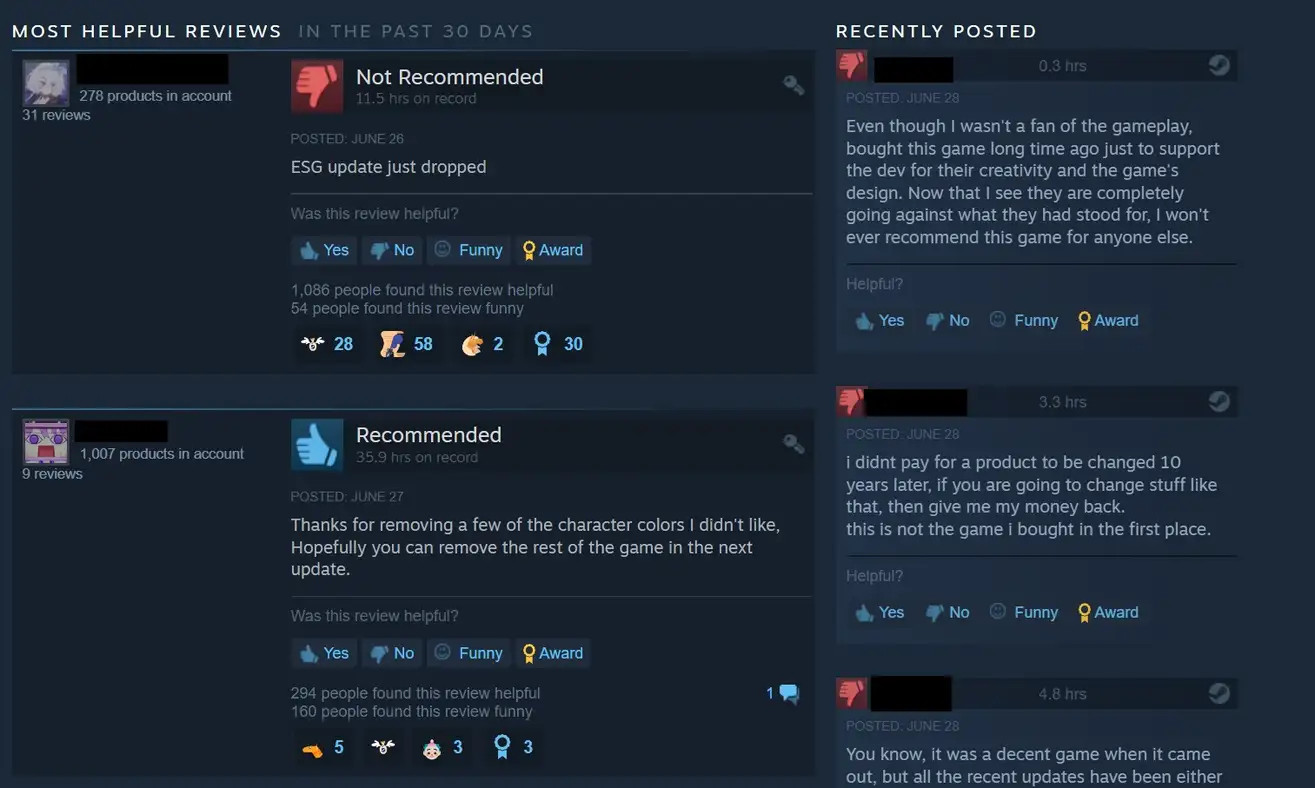 Dù vậy, động thái này đã không nhận được sự đồng thuận từ phía game thủ. Hơn 600 đánh giá tiêu cực đã được đăng tải trên trang Steam của game, trong khi đó, Twitter nhanh chóng trở thành tâm điểm bùng nổ tranh cãi khi nhiều người thể hiện sự không hài lòng với các thay đổi trong thiết kế nhân vật.