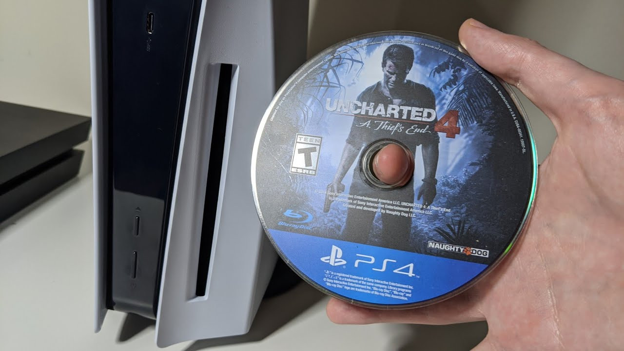 alt text: Một người đang cầm đĩa game PS4 trên tay, với máy PS5 ở phía sau