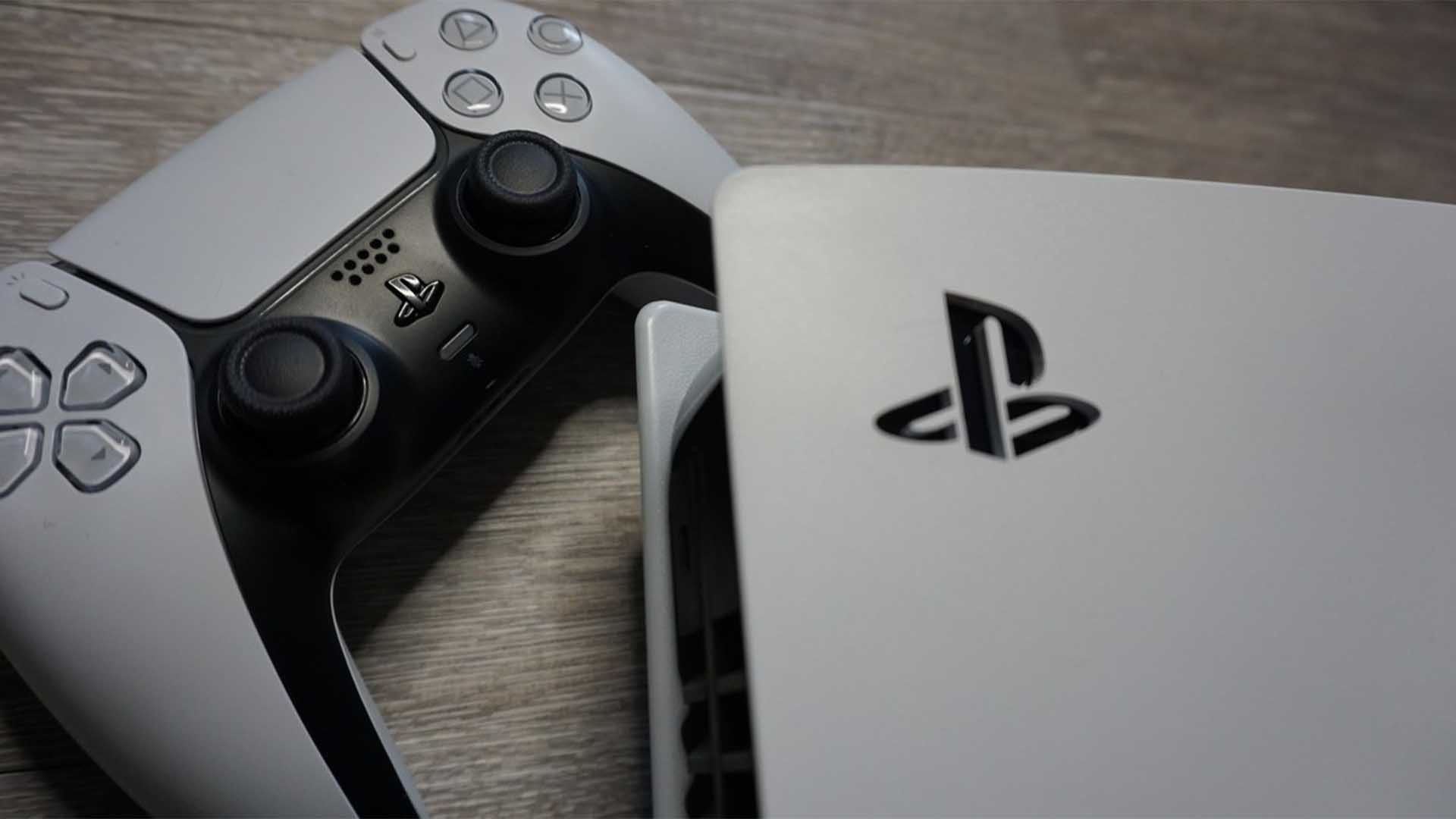 alt text: Máy PS5 và tay cầm DualSense trên nền giao diện PlayStation Plus