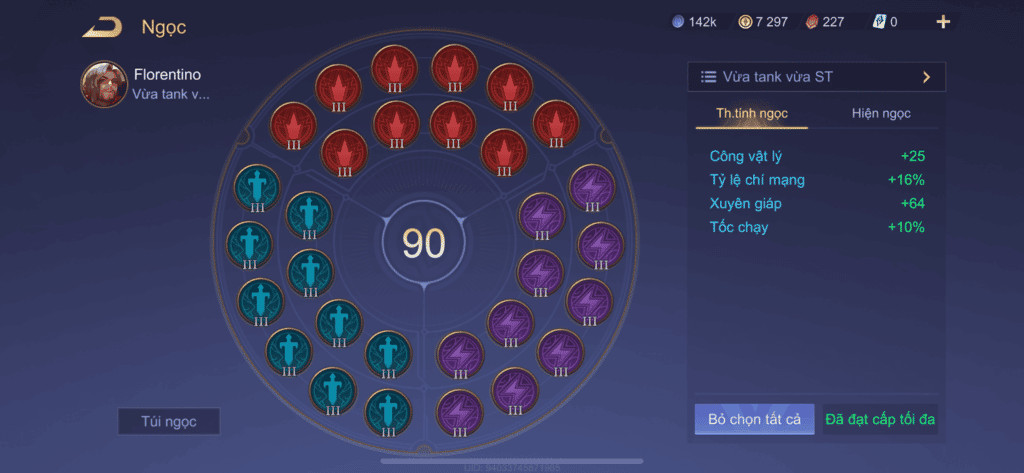 Với bảng ngọc cho Florentino này giúp gia tăng đáng kể sức mạnh, hỗ trợ cả công vật lý và tốc độ di chuyển, rất quan trọng ngay từ đầu game.