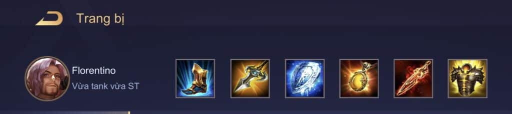 Tướng tự như cách lên đồ đi top, với Florentino đi rừng, bạn sẽ có thêm Rìu Leviathan và Nham Thuẫn giúp gia tăng khả năng chống chịu trong những pha giao tranh nhưng vẫn cung cấp lượng công vật lý cho hắn.