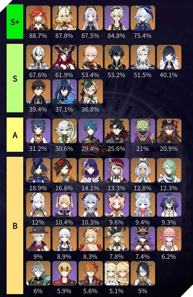 Đứng đầu danh sách không ai khác chính là Hỏa Thần Mavuika, kết quả không nằm ngoài dự đoán của cộng đồng. Tỷ lệ chiến thắng của Hỏa Thần lên đến 88,7%, cho thấy đây là một nhân vật rất mạnh mẽ trong các màn đấu mới trong La Hoàn. Theo sau Hỏa Thần là hai nhân vật hỗ trợ mạnh mẽ, đó là Citlali và Xinlonen. Hai nhân vật hỗ trợ đến từ Natlan này cũng đang thể hiện khả năng buff rất mạnh, ngày càng được cộng động game thủ tin dùng trong các đội hình mạnh.