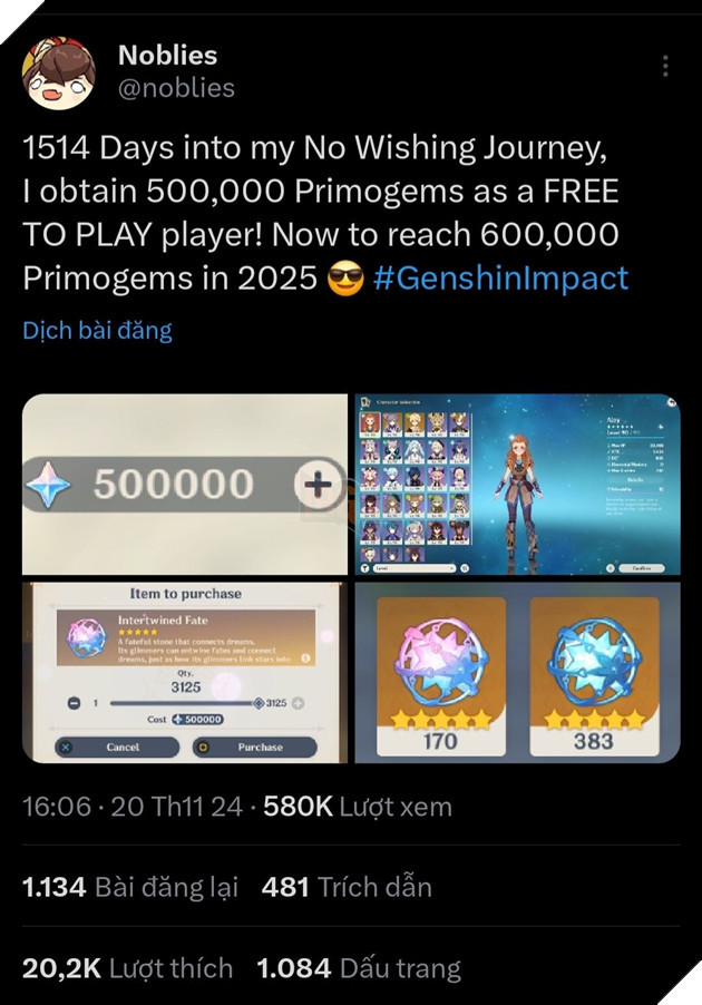 Genshin Impact là một trong những tựa game gacha nổi tiếng nhất hiện nay, thu hút một lượng lớn người chơi trên toàn thế giới. Khi tham gia vào thế giới rộng lớn của game, một trong những yếu tố quan trọng nhất đối với mỗi game thủ chính là Nguyên Thạch, nguồn tài nguyên chủ yếu để mở khóa nhân vật và trang bị mới. Trong bài viết này, chúng ta sẽ cùng khám phá hành trình 4 năm tích lũy Nguyên Thạch của một game thủ xuất sắc, người đã đạt được thành tích ấn tượng với hơn 500.000 Nguyên Thạch mà không tiêu tốn một đồng nào từ ví của mình.