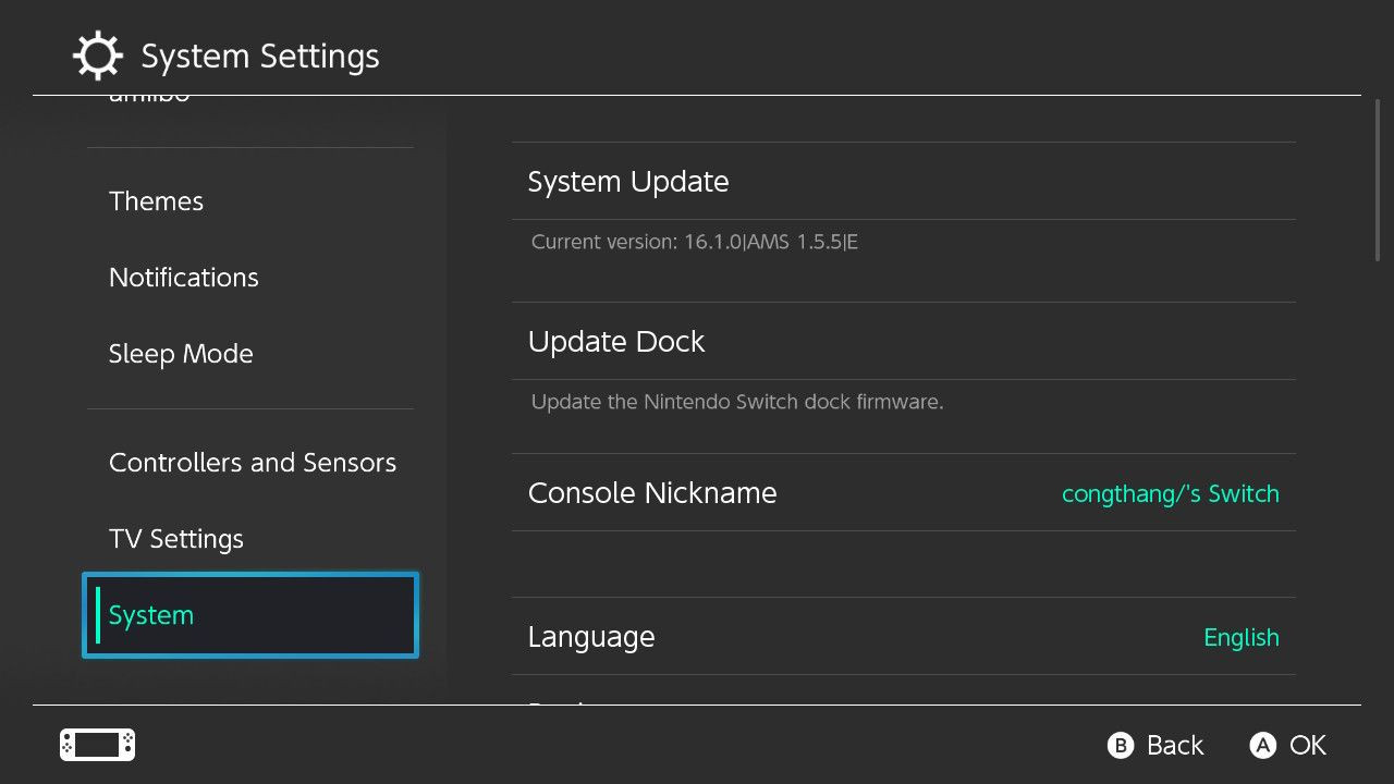 Hình ảnh minh họa việc kiểm tra phiên bản hệ điều hành trên Nintendo Switch Modchip