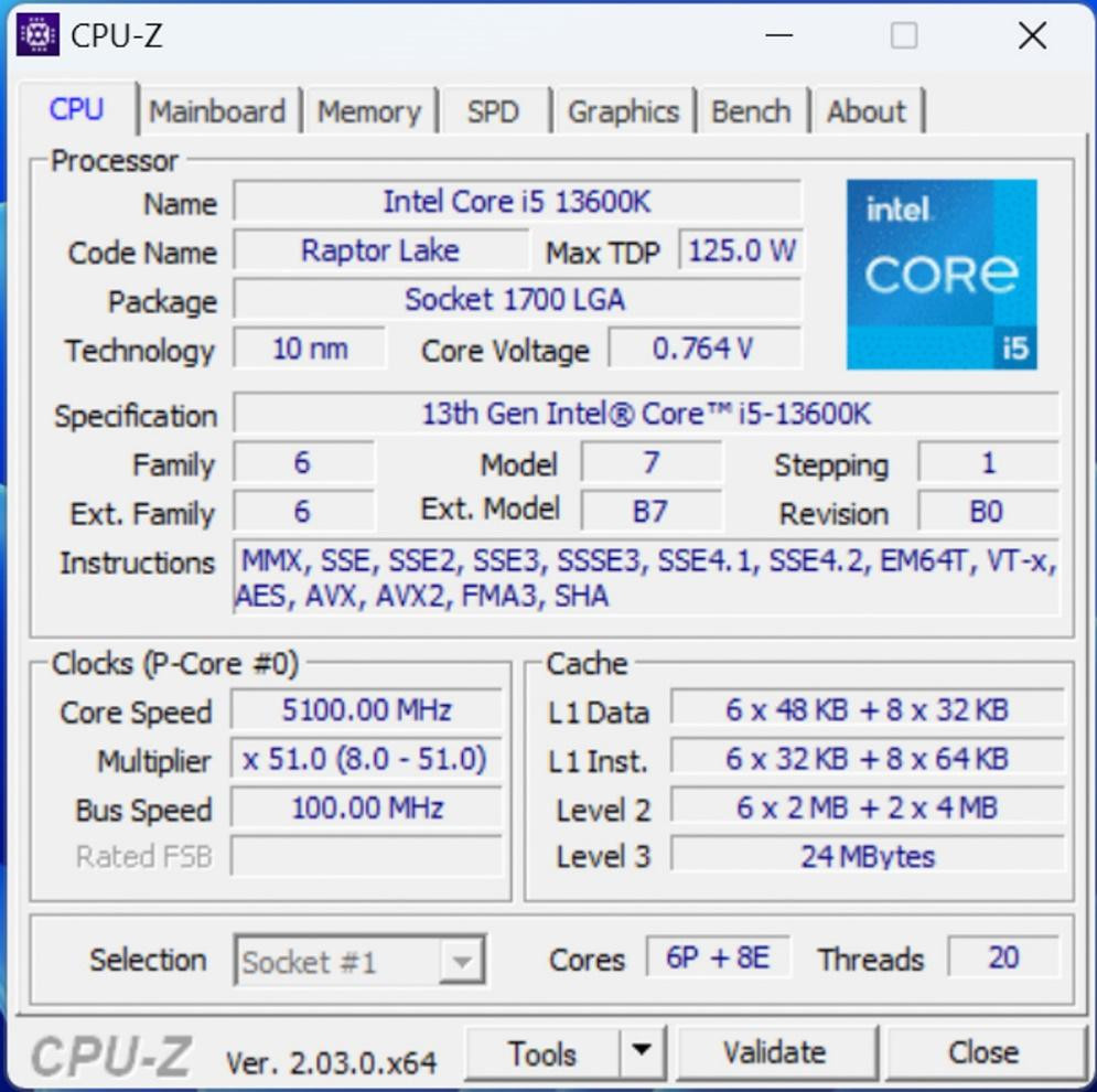 Sử dụng phần mềm CPU-Z quen thuộc, Core i5-13600K đã thể hiện được sức mạnh của mình với khả năng xử lý mượt mà trong cả các bài test đơn nhân và đa nhân.