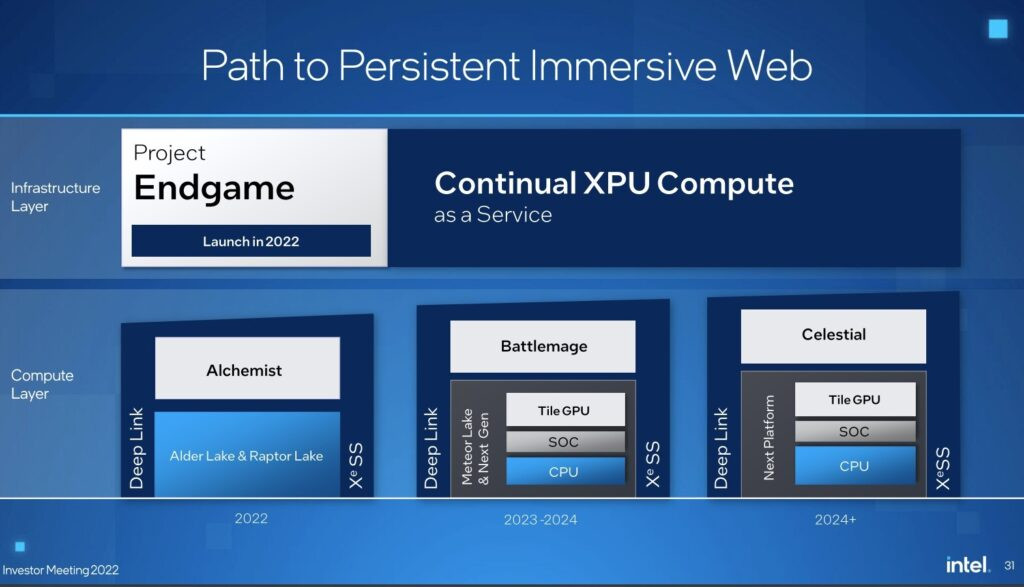 Với kế hoạch này, Intel không chỉ dừng lại ở việc cung cấp card đồ họa cho năm 2022 mà còn có những tham vọng lớn hơn. Hãng dự kiến sẽ phát triển các thế hệ card đồ họa mới hàng năm trong ba năm tới, bắt đầu với Alchemist trong năm 2022, với các thế hệ tiếp theo như Battlemage khoảng năm 2023-2024 và Celestial sau năm 2024.