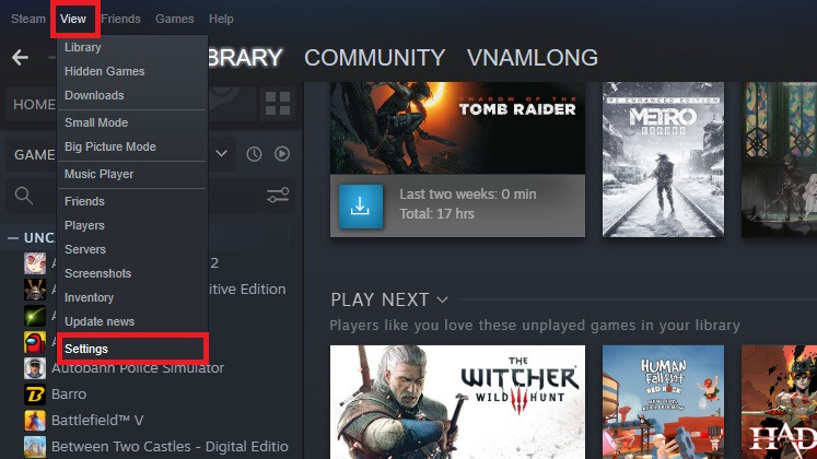 Để bắt đầu, hãy mở ứng dụng Steam của bạn. Tại giao diện chính, tìm và nhấp vào View ở góc trên bên trái. Sau đó, chọn Settings từ menu xổ xuống.