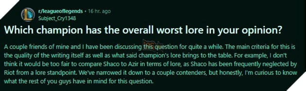 Ngược lại, có một quan điểm khác cho rằng nhân vật Cho’Gath cũng nằm trong danh sách cốt truyện nghèo nàn. Mặc dù được thiết kế với hình ảnh khủng khiếp và những câu chuyện rùng rợn, nhưng cốt truyện của Cho’Gath lại không mang lại nhiều sự kết nối với người hâm mộ, khiến hắn trở thành một nhân vật thiếu sức hút trong vũ trụ LMHT.