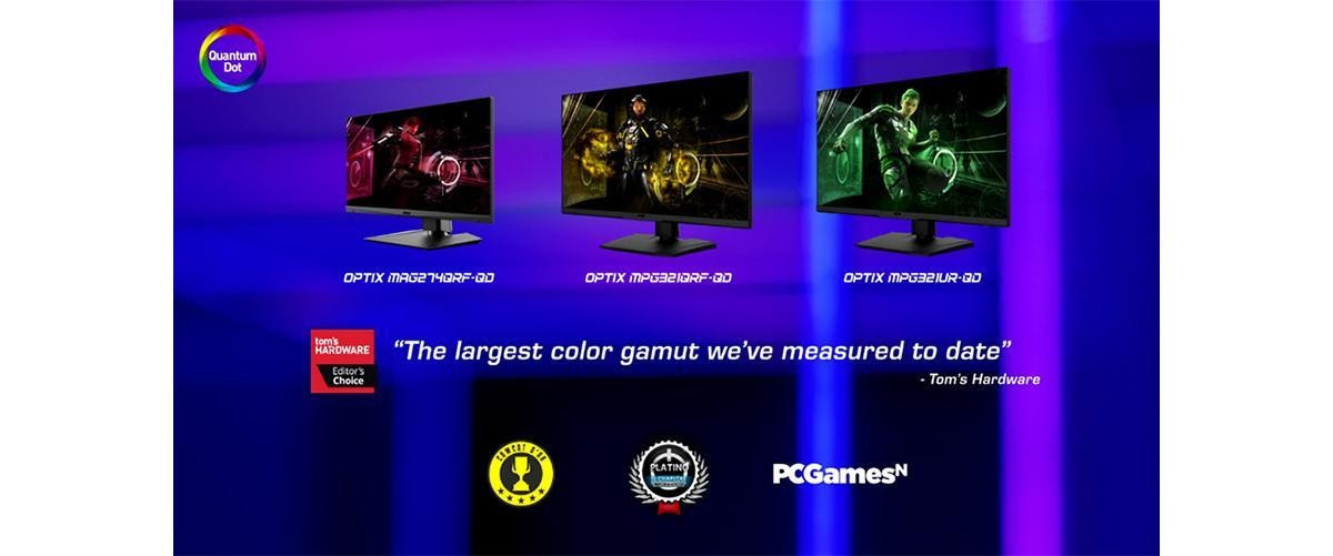 Dòng màn hình gaming MSI QD được giới thiệu với khả năng hiển thị màu sắc rộng, nhờ vào công nghệ chấm lượng tử và phần mềm cải tiến giúp cân chỉnh màu sắc sắc nét hơn.