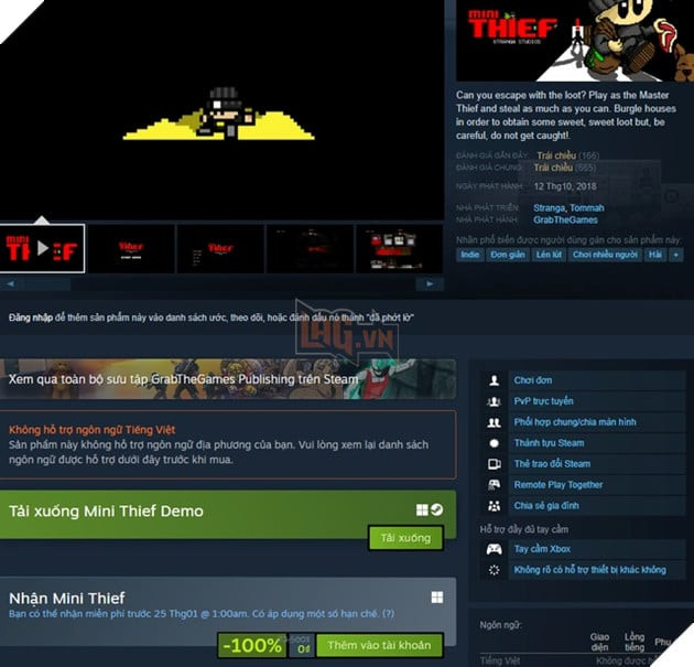 Mới đây, Steam đã công bố một chương trình tặng game độc quyền dành cho người dùng. Trò chơi miễn phí Mini Thief sẽ chính thức có mặt trên nền tảng vào ngày 25/01 sắp tới. Game thủ chỉ cần thực hiện một số thao tác đơn giản là có thể thêm trò chơi này vào thư viện của mình một cách dễ dàng.