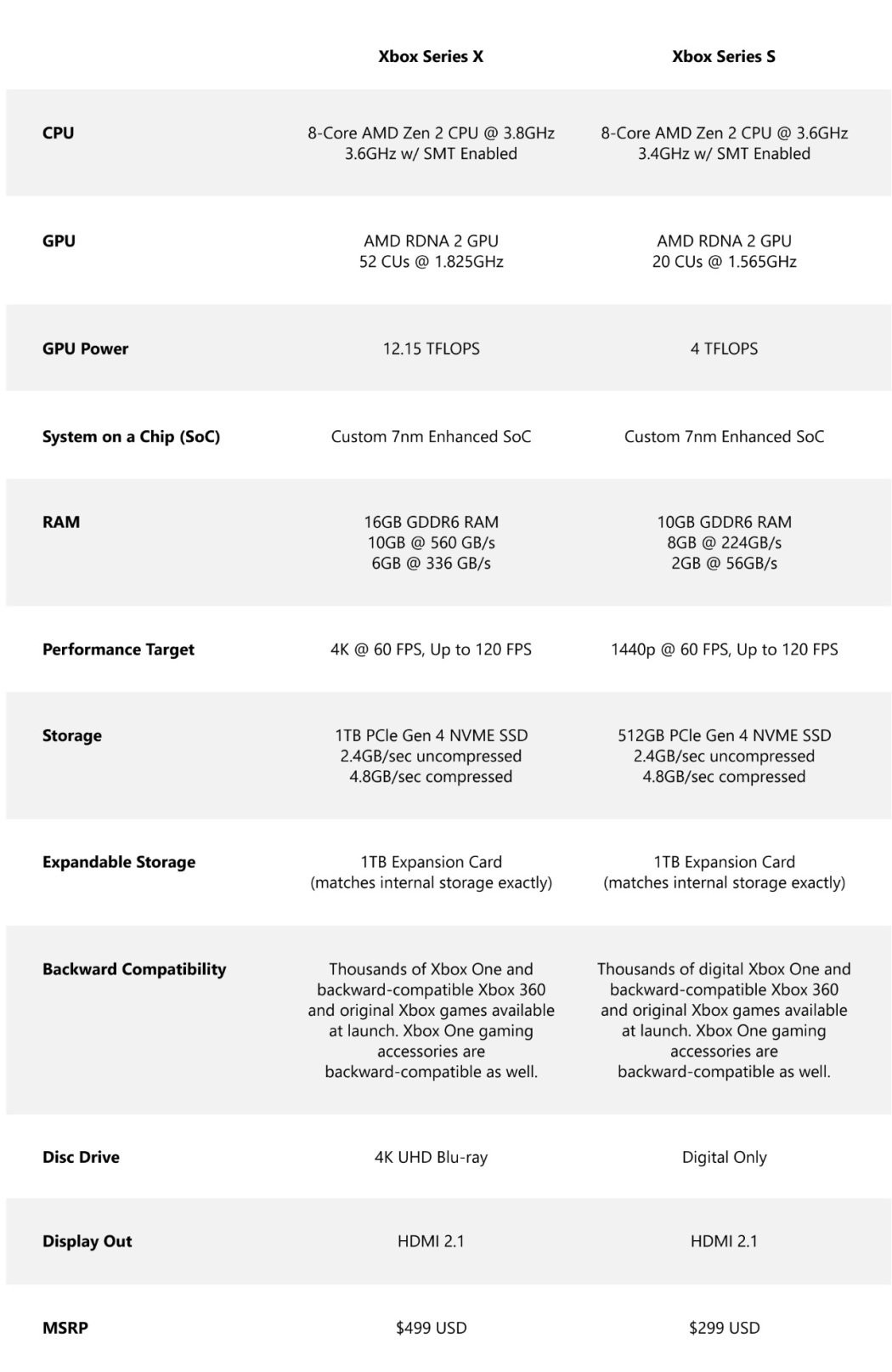 alt text: Bảng so sánh cấu hình chi tiết giữa Xbox Series X và Xbox Series S, bao gồm CPU, GPU, RAM, ổ cứng và các thông số kỹ thuật khác.