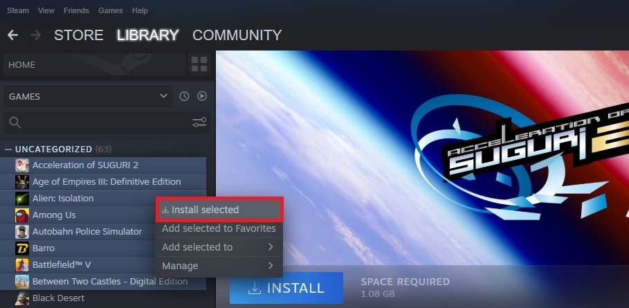 - Nhấn chuột phải vào một trong các tựa game đã chọn và chọn “Install selected”.