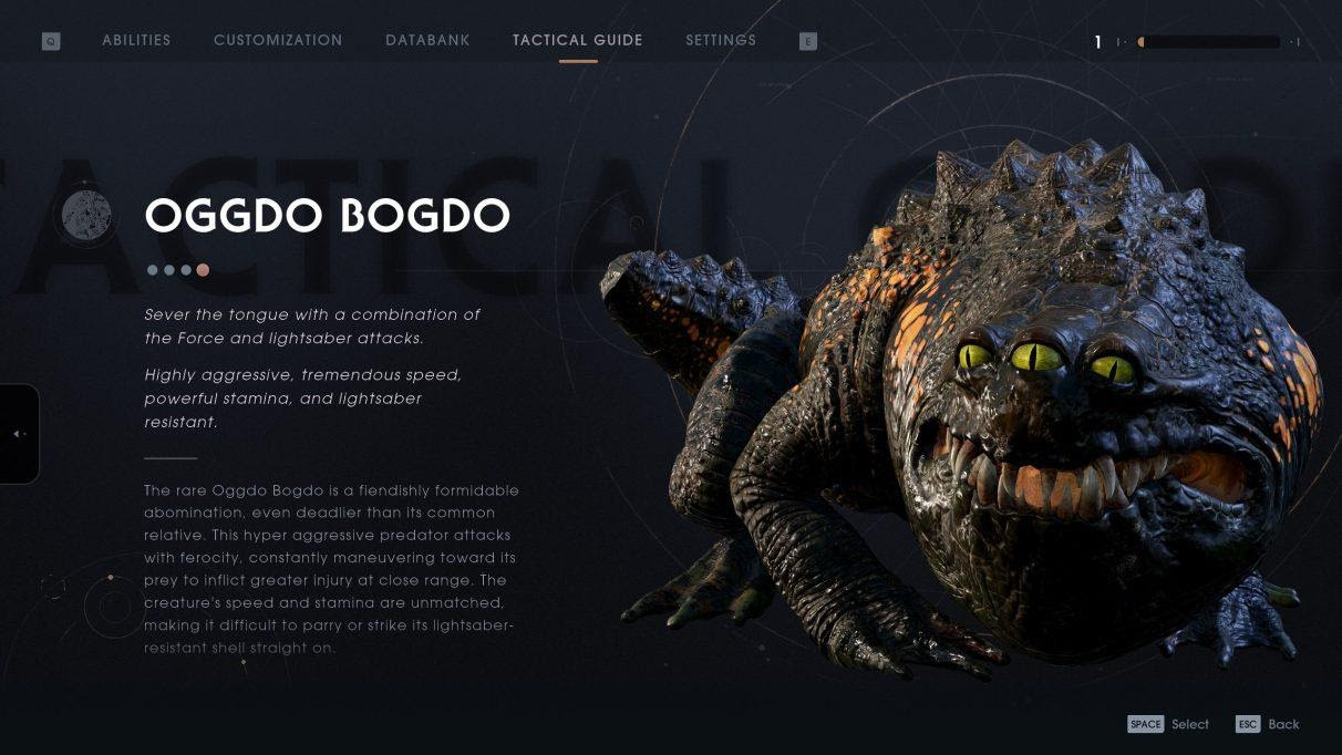 Oggdo Bogdo là một trong những kẻ địch đầu tiên bạn gặp trong Star Wars Jedi: Fallen Order. Mặc dù có thể phải đối mặt với nó từ sớm, nhưng con ếch này thực sự được thiết kế để thách thức người chơi ở giai đoạn sau khi họ đã nâng cấp. Những đòn tấn công bất ngờ từ xa hay cận chiến có thể khiến ngay cả những người chơi dày dạn kinh nghiệm cảm thấy khó khăn.
