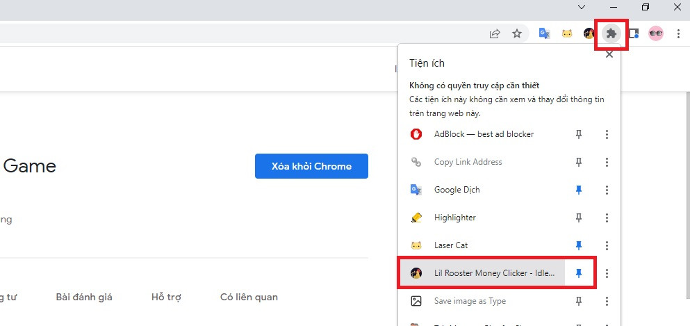 Khi tiện ích đã được cài đặt, hãy nhấn vào biểu tượng mảnh ghép trên thanh trình duyệt, tìm kiếm Lil Rooster Money Clicker và chọn Ghim để dễ dàng truy cập sau này.